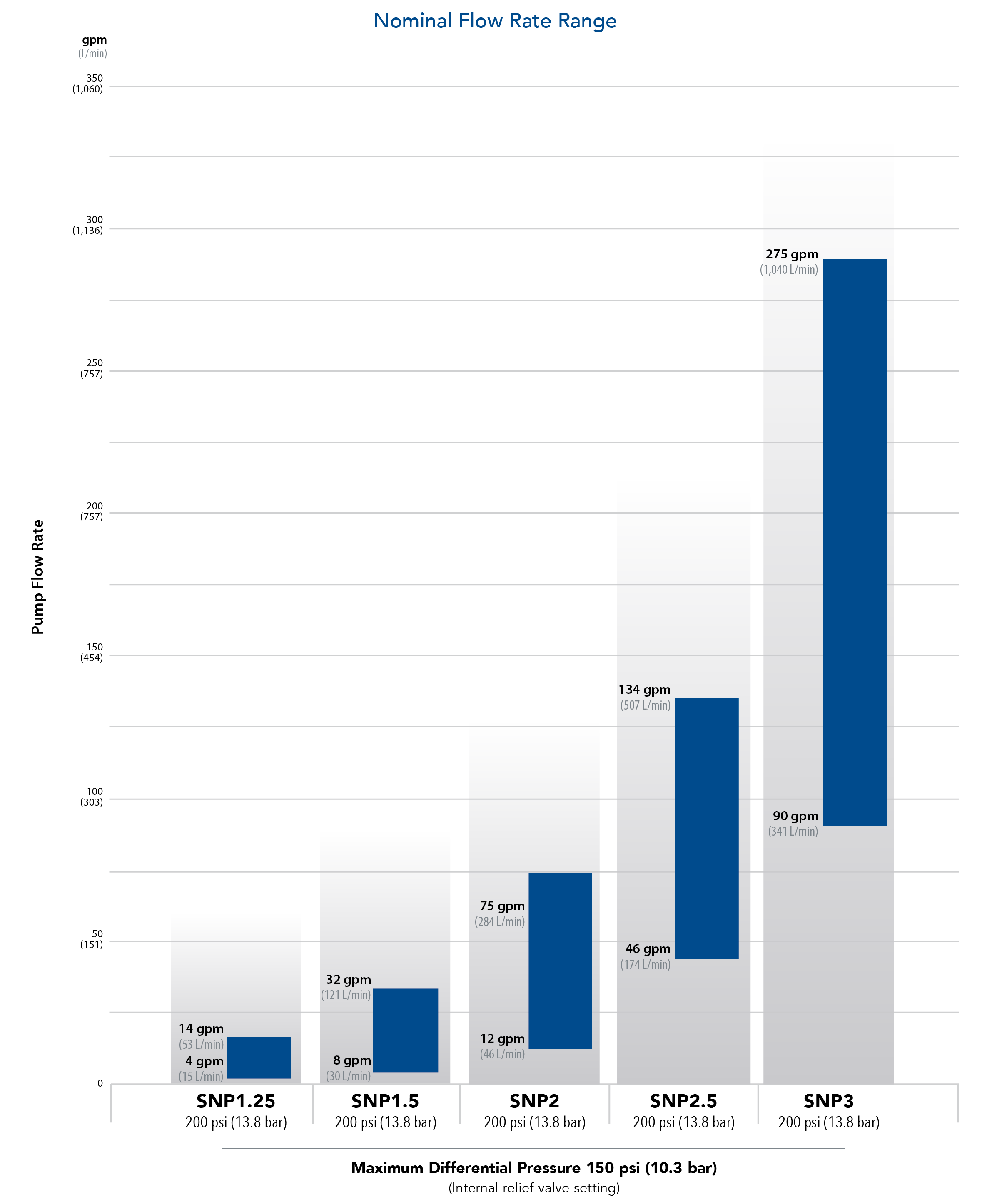 With flow rates of 75 to 275 U.S. gpm (178 to 1,040 L/min) and standard operating temperatures of -25°F to 350°F (-31°C to 177°C), the SNP 2- and 3-in pumps offer the best combined characteristics of sustained high-level performance, energy efficiency, trouble-free operation and low maintenance cost.